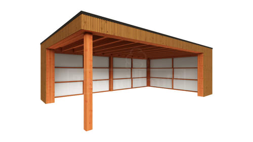 Inclusief: Regelpakketten voor dichte wanden, dampopen folie, ventilatielatten, EPDM rubberfolie als dakbedekking, zwarte aluminium daktrim recht, hemelwaterafvoer, bevestigingsmateriaal en opbouwhandleiding. Exclusief: gevelbekleding.