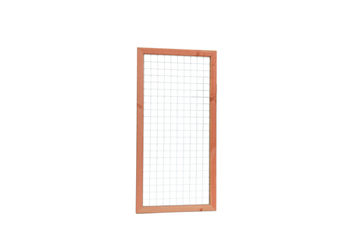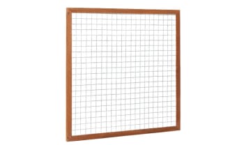Betonijzertrellis met verzinkt betonijzer en een douglas raamwerk van 4,5x7 cm. Het betonijzer heeft een maaswijdte van 7,5x7,5 cm en een doorsnede van ø 5 mm.