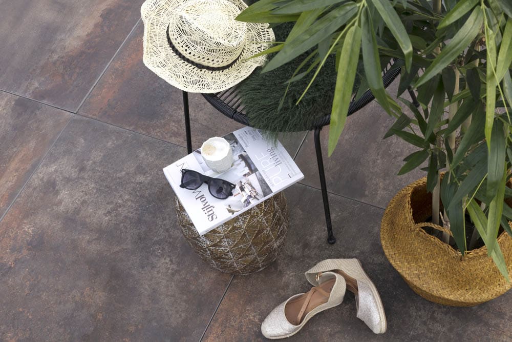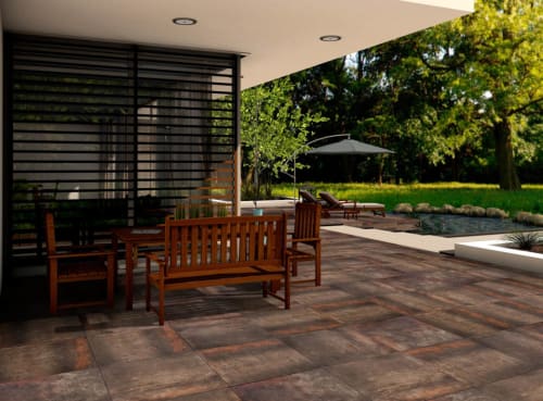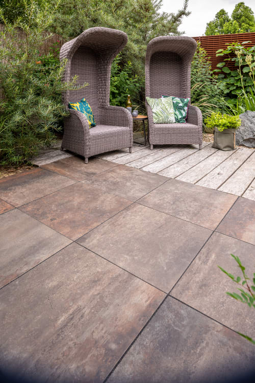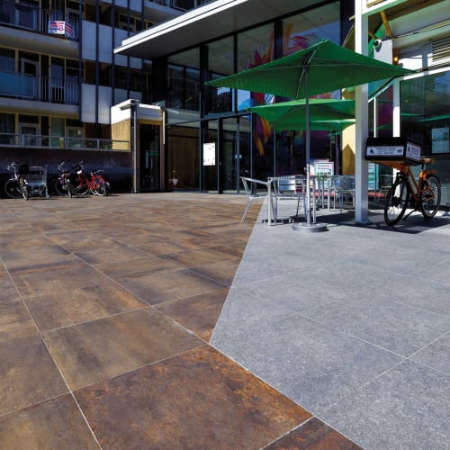 De Baltramica Cortensteel is een keramische buitentegel met een warme roestkleurige uitstraling die doet denken aan cortenstaal. Deze tegel geeft je tuin of terras een eigentijdse, natuurlijke en karaktervolle sfeer. De diepe bruine tinten zorgen voor een warme, uitnodigende uitstraling en maken de tegel goed te combineren met diverse materialen en tuinstijlen. De tegel bestaat uit 1 cm keramiek verlijmd op een 3 cm dikke betonnen drager, waardoor je profiteert van de slijtvastheid en het onderhoudsgemak van keramiek, gecombineerd met de stevigheid van beton.