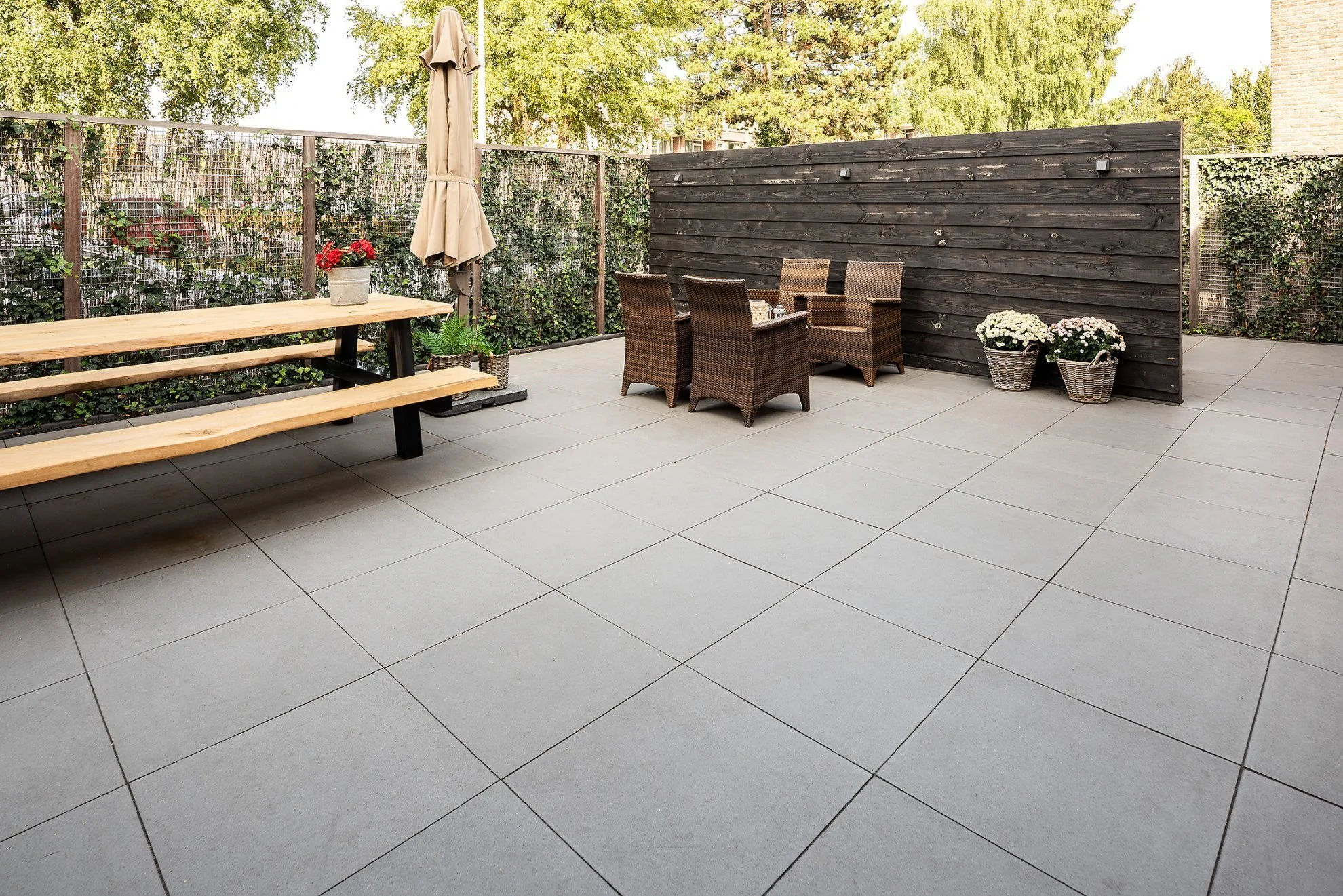 Achtertuin met een gezellig terras dat gelegd is met de mooie terras & trends Stravenda tegel.