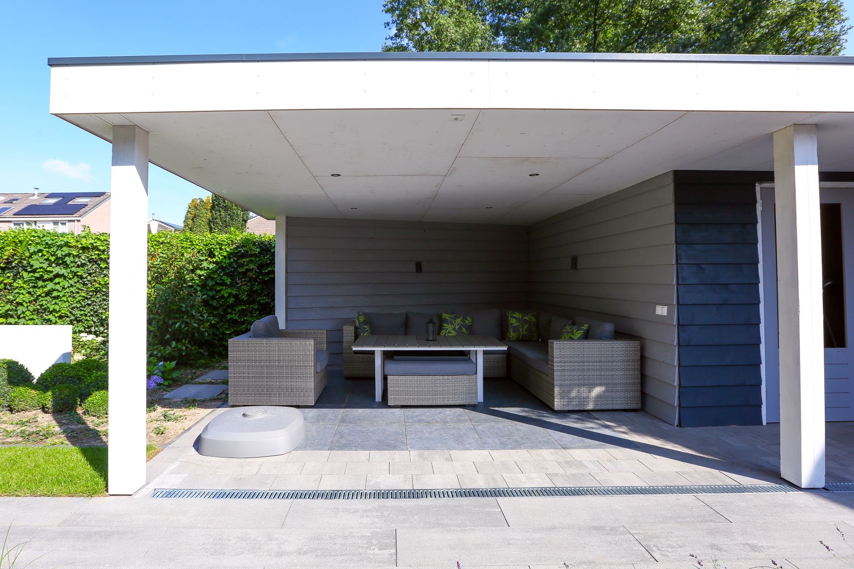 Chique en moderne familietuin met strakke overkapping waar een mooie jacuzzi geïnstalleerd is. Aan de buitentafel is ruimte voor het hele gezin en de ligbedden zorgen voor een heerlijk relaxmomentje.