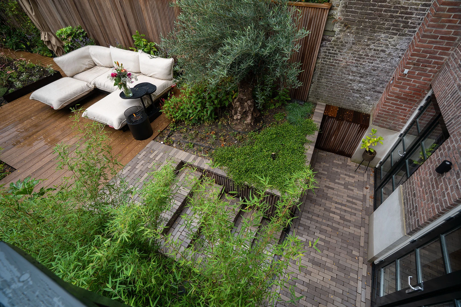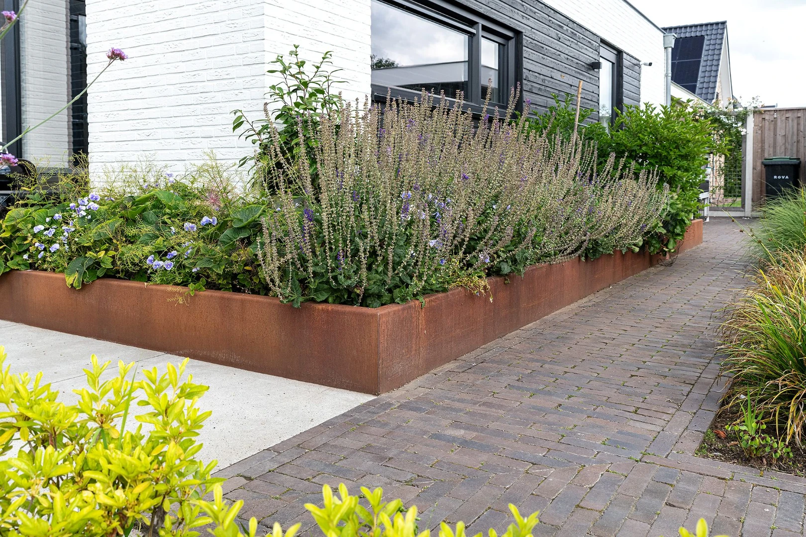 Het roestige cortenstaal van de borders contrasteert mooi met het diepe bruin van de gebakken Iseo Antica en het koele grijs van de Oudhollandse tegels.