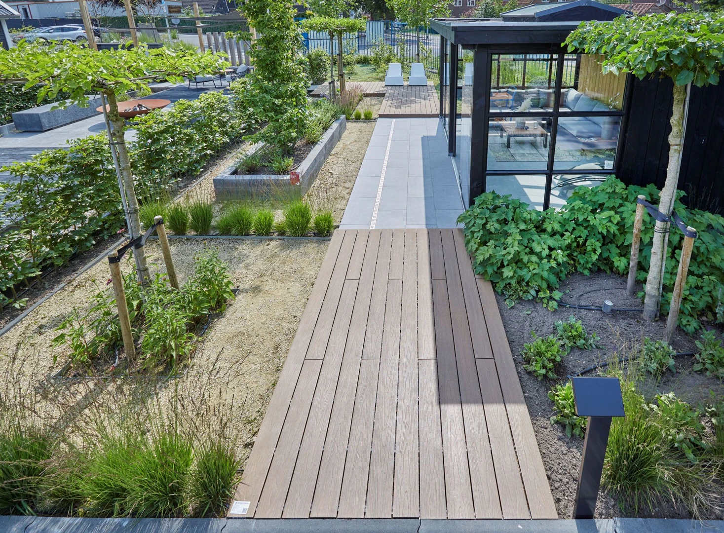 De houtlook vlonderplanken van Millboard geven een warme, natuurlijke uitstraling aan de tuin. De zwarte traptreden zorgen voor een strak contrast en een moderne touch. Hierdoor knalt het groen er nog meer uit. De zand/grijskleurige gebakken stenen brengen rust en verbinden de tinten op een subtiele manier.