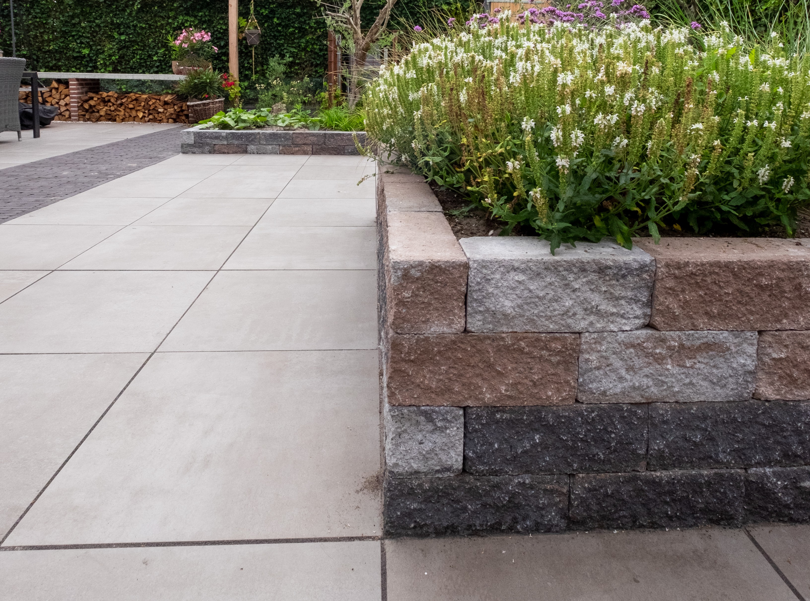 Daarnaast is het slim om materialen te laten terugkomen op meerdere plekken in de tuin. Zo kunnen dezelfde muurblokken gebruikt worden voor zowel een border als een zitmuur, of kunnen gebakken klinkers zowel in een pad als randafwerking terugkomen.