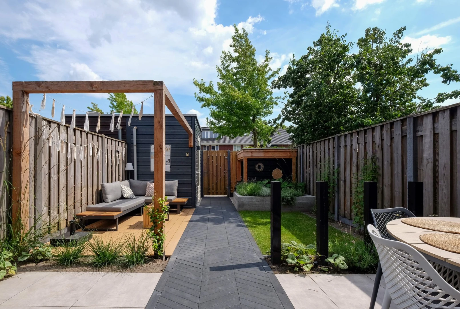 Het donkere visgraatpatroon geeft diepte en karakter, terwijl de lichte vlonderplanken het geheel luchtig maken. Samen ontstaat een stijlvol contrast dat uitnodigt om buiten te ontspannen.