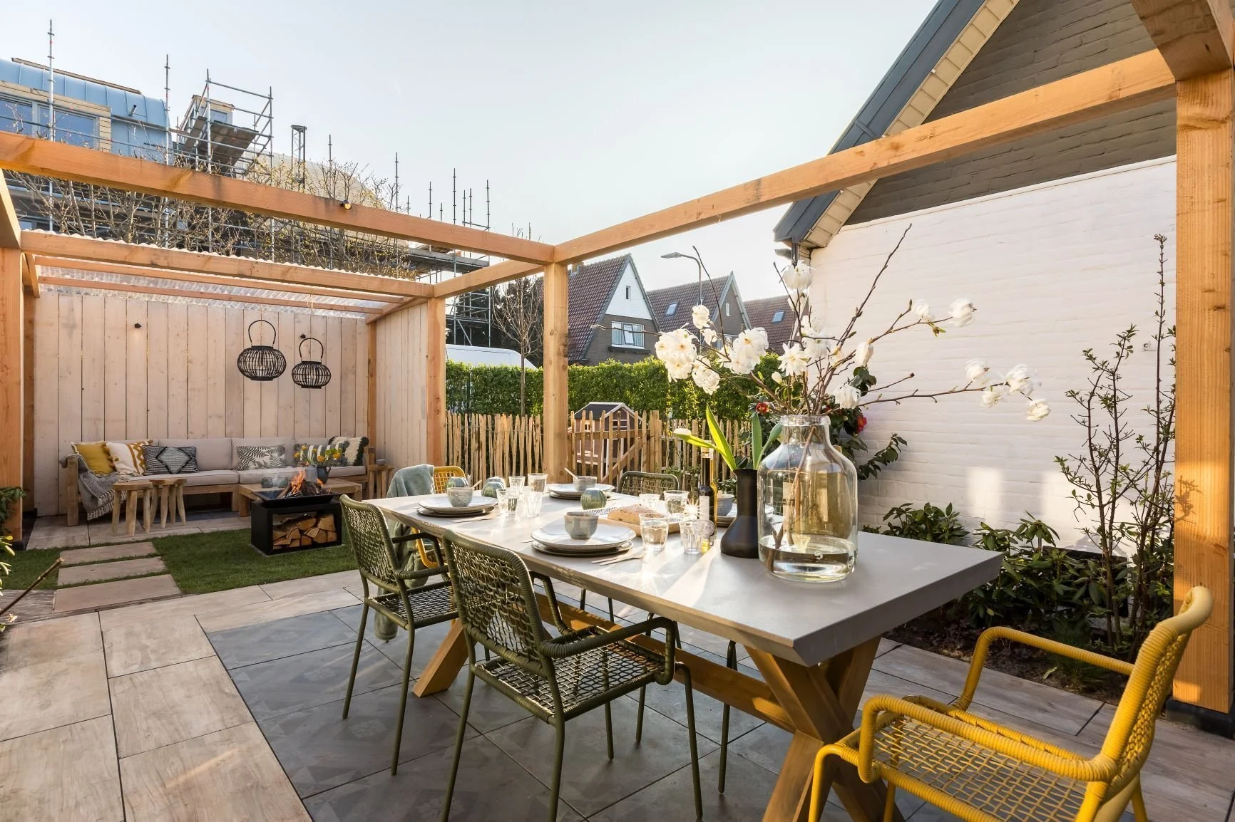 Een dierrijke famlietuin voorzien van een praktische en sfeervolle overkapping. Dankzij het kastanjehek kunnen de kippen lekker in de buitenlucht rondlopen. Zelfvoorziening is nog nooit zo makkelijk en leuk geweest met een eigen kas in de tuin.
