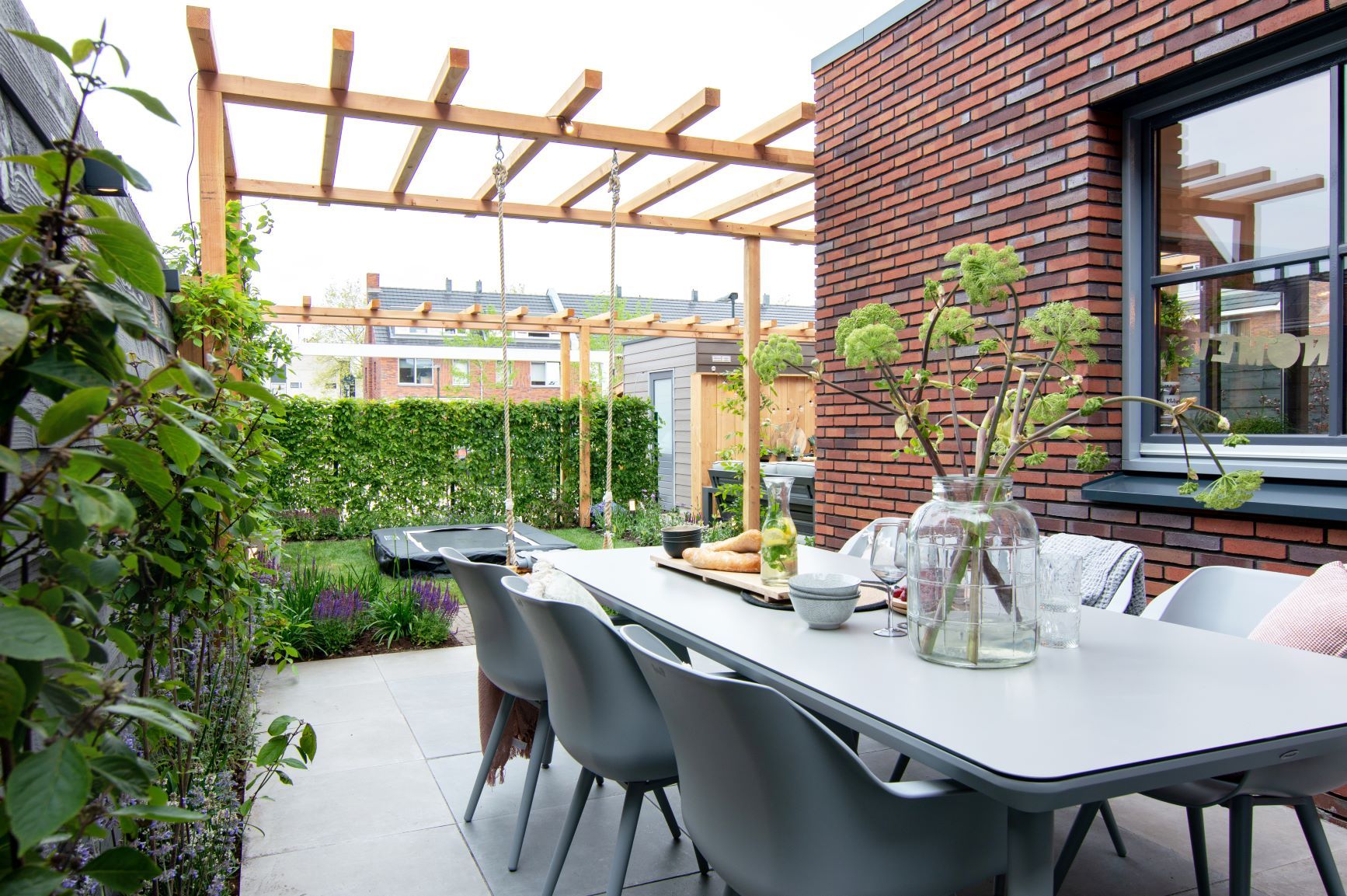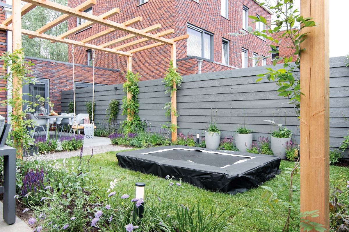 Sfeervolle familietuin met een zithoek, zowel een loungeset als een eethoek. De kinderen vermaken zich op de trampoline en de schommel. Ook is de tuin voorzien van een buitenkeuken met mooie verlichting, wat voor veel sfeer zorgt.