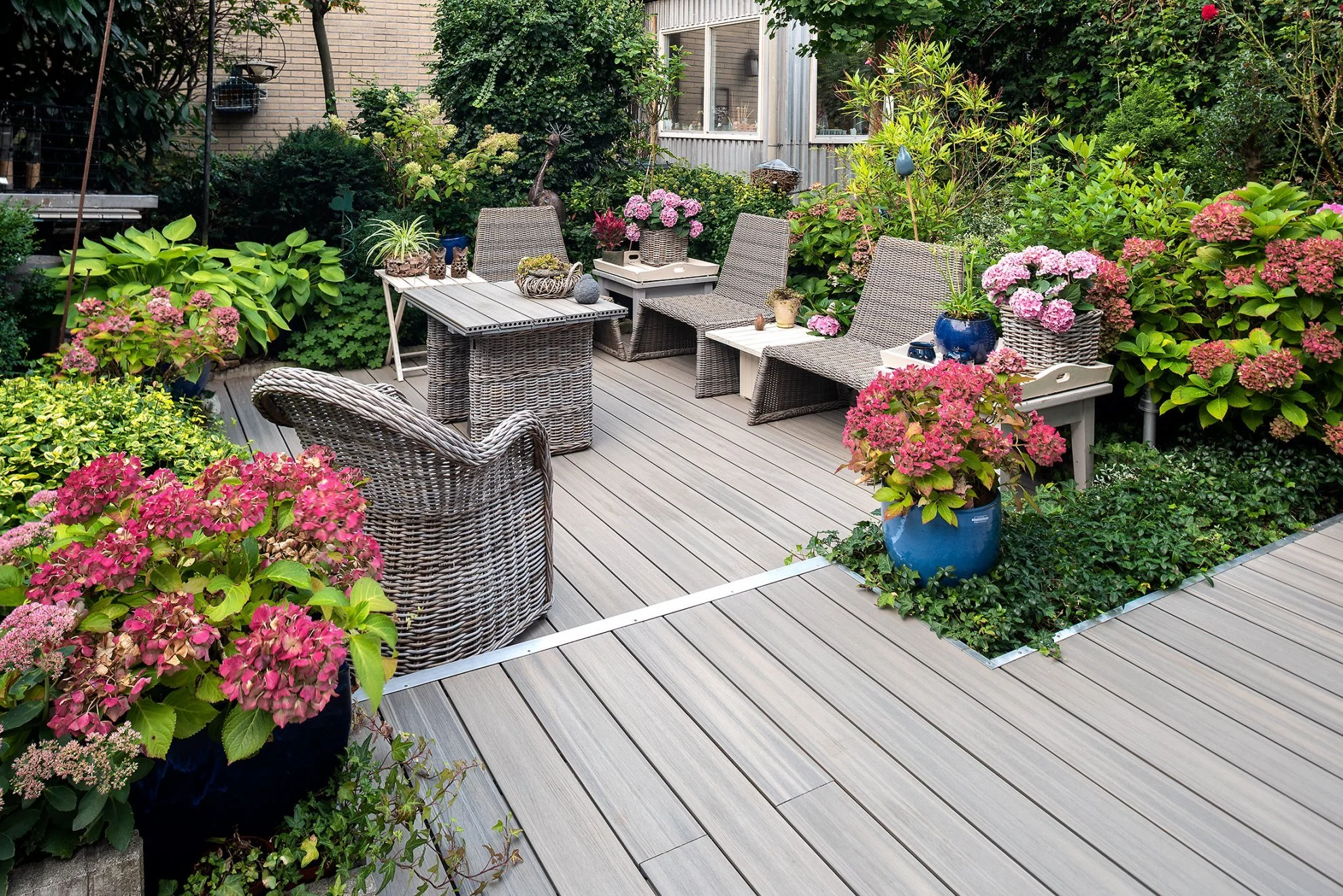 Groenrijke achtertuin met veel kleur voorzien van de terras en trend Deck planken.