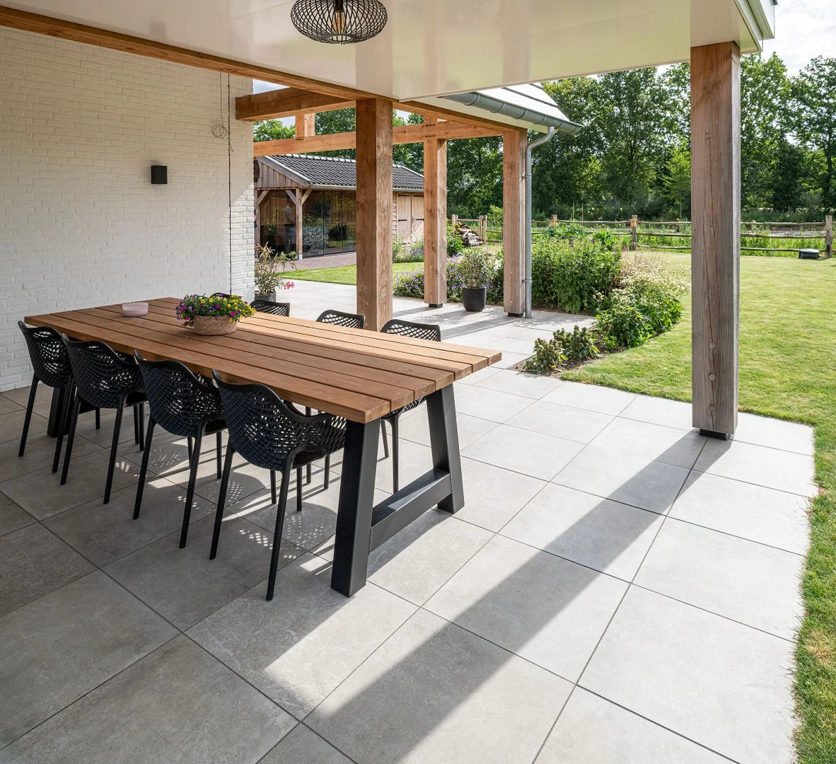 In deze ruime tuin is gekozen voor een eigentijdse, maar warme uitstraling waarin comfort en stijl hand in hand gaan. Het hart van de tuin wordt gevormd door een royaal terras, gedeeltelijk overdekt zodat er in elk seizoen genoten kan worden van het buitenleven. Voor de bestrating is gekozen voor de GeoCeramica® tegel: een hoogwaardige keramische tegel met een subtiel beige-grijze tint. Deze kleur brengt een zachte, natuurlijke warmte in de tuin en combineert moeiteloos met zowel groen als houttinten.
