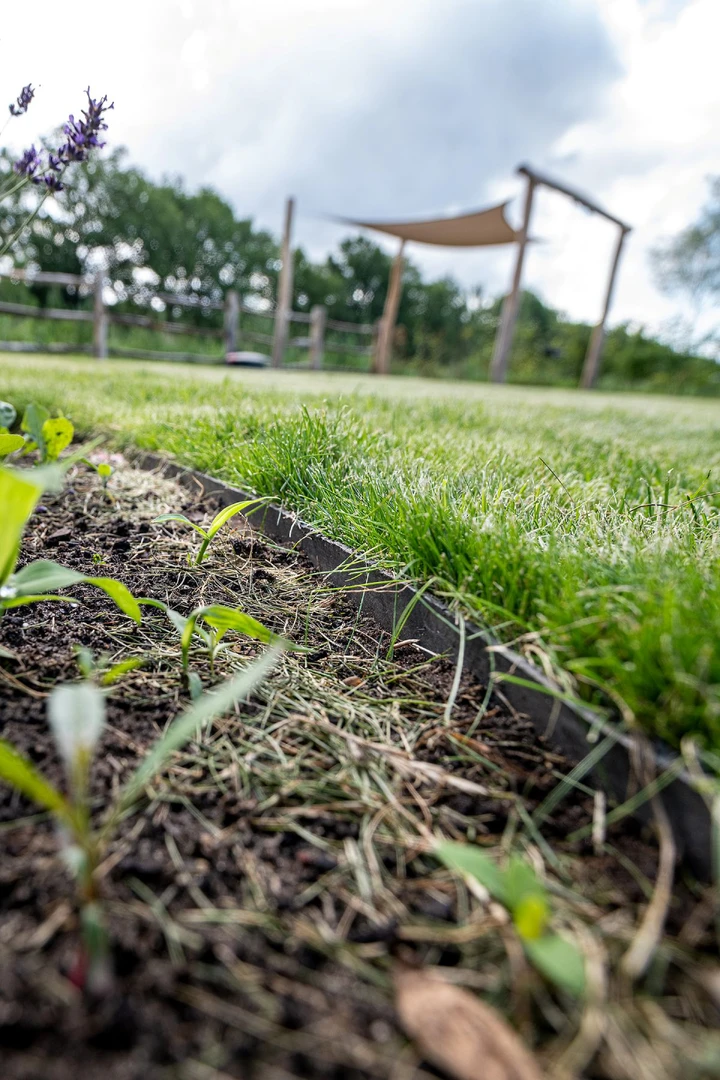 Rondom het terras en langs het looppad zijn borders gecreëerd, afgezet met flexibele Ecoboard borderranden. Deze duurzame en buigzame randen maken het mogelijk om zowel strakke lijnen als vloeiende, natuurlijke vormen te realiseren. De beplanting in de borders voegt kleur, textuur en seizoensbeleving toe, waardoor de tuin door het jaar heen telkens een ander karakter krijgt.