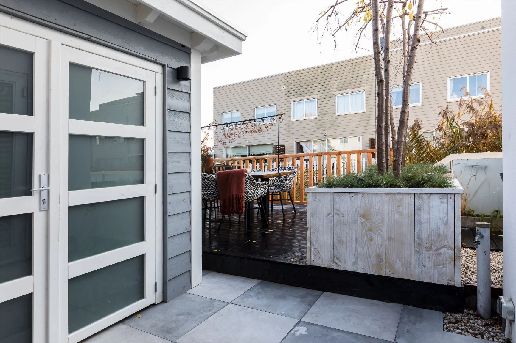 Sfeervolle, moderne tuin met veel verschillende plantensoorten. Verder is de achtertuin in de hoek voorzien van een heerlijke loungeset met een moderne buitenhaard.