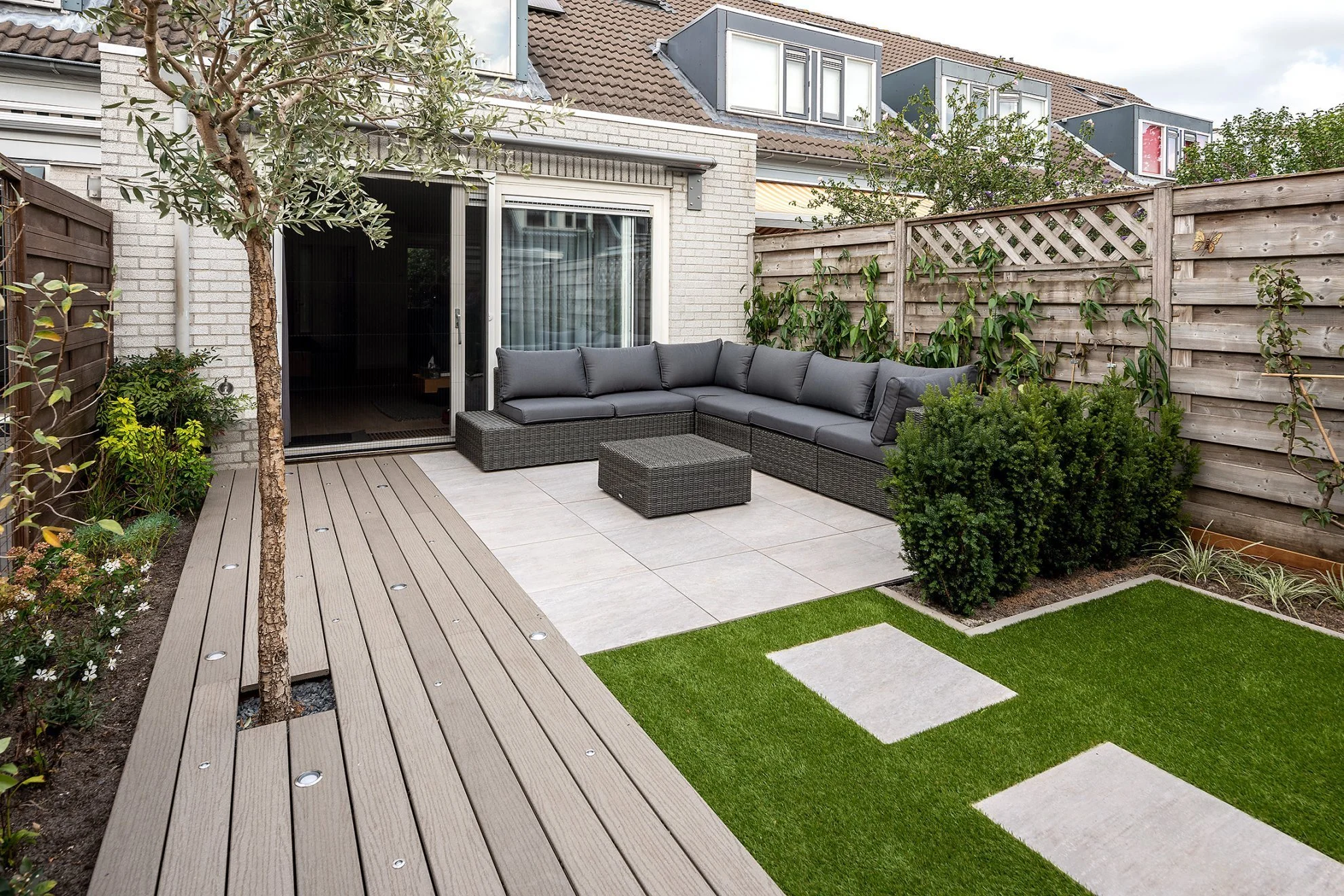 Strakke achtertuin met in de hoek een loungestak. De tuin is voorzien van inlite verlichting, wat zorgt voor een mooie sfeer in de achtertuin.