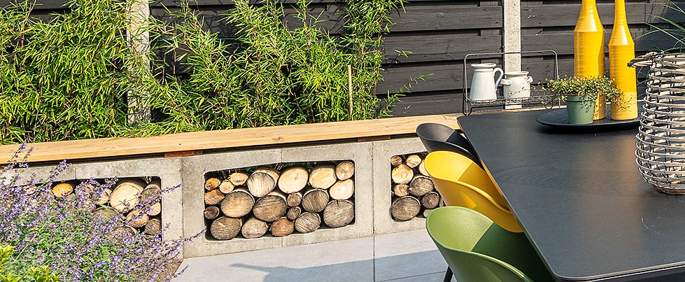 Heb je een gezellig vuurkorfje in de tuin maar geen goede plek voor de houtblokken? Ook in dit geval kun je creatief met U-elementen aan de slag. Zet de elementen tegen elkaar aan, maar dit keer staand. Maak een rijtje van drie blokken. Zet hier wat kussentjes op en je hebt een DIY-bankje! Plaats in de lege ruimtes de houtblokken en je hoeft ook nooit meer ver te lopen voor nieuw hout.